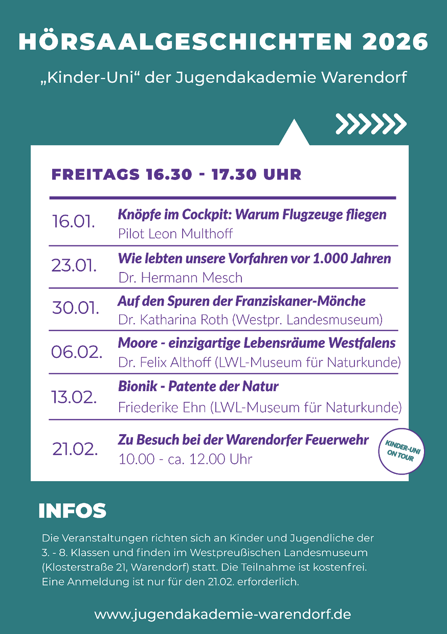 Die Hörsaal-Geschichten finden vom 16.01. - 13.02.2026 (jeweils freitags) von 16.30 Uhr bis ca. 17.30 Uhr im Westpreußischen Landesmuseum Warendorf (Klosterstraße 21) statt. Am Samstag, 21. Februar findet erneut "Kinder-Uni on Tour" statt, mit einem Ausflug zur Warendorfer Feuerwehr.