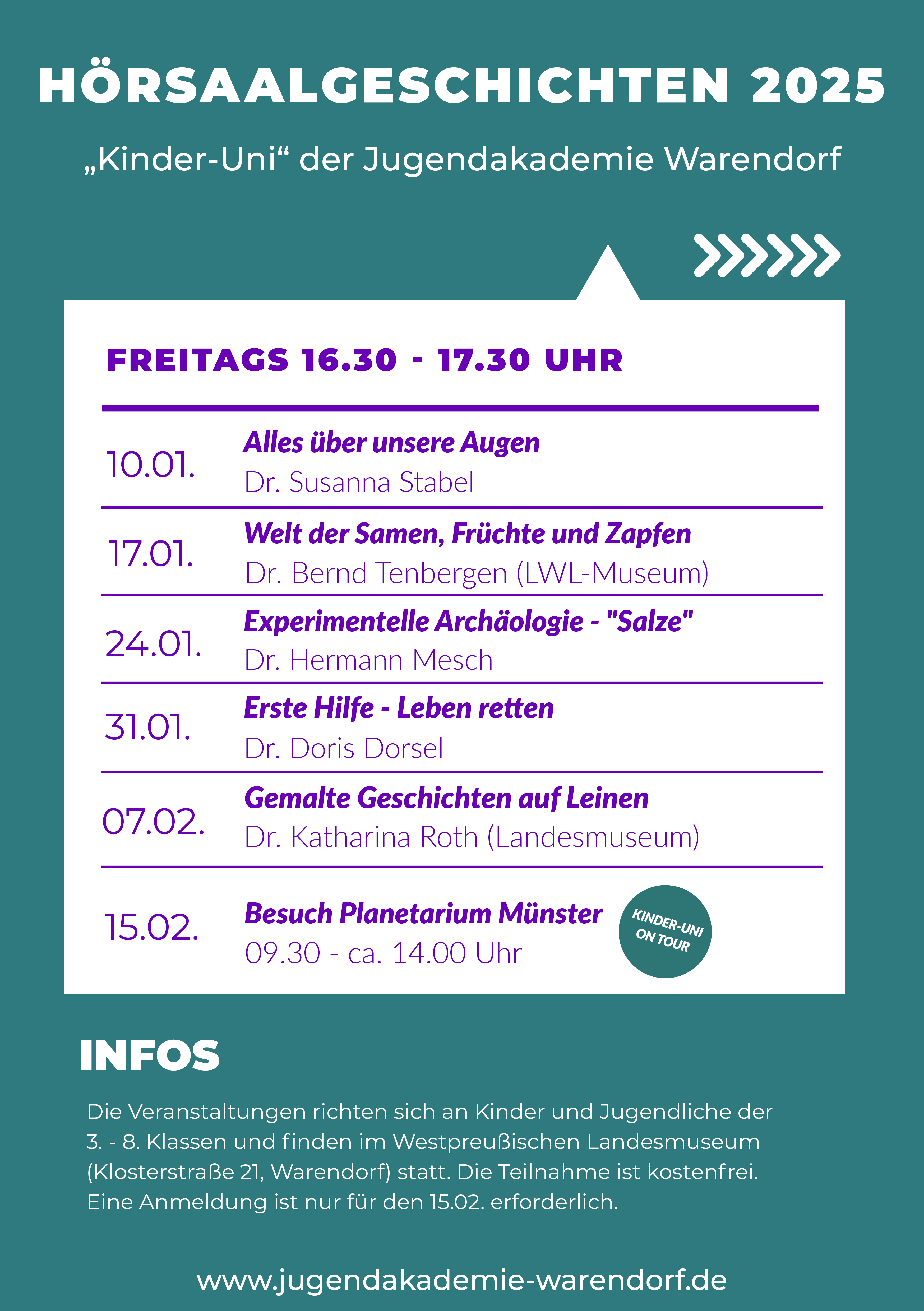 Die Hörsaal-Geschichten fanden vom 10.01. - 07.02.2025 (jeweils freitags) von 16.30 Uhr bis ca. 17.30 Uhr im Westpreußischen Landesmuseum Warendorf (Klosterstraße 21) statt. Am 15. Februar fand erstmalig "Kinder-Uni on Tour" statt, mit einem Ausflug ins Planetarium nach Münster.Die nächsten Hörsaalgeschichten finden Anfang 2026 statt.